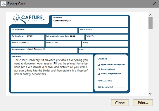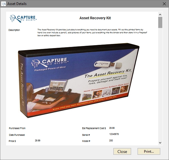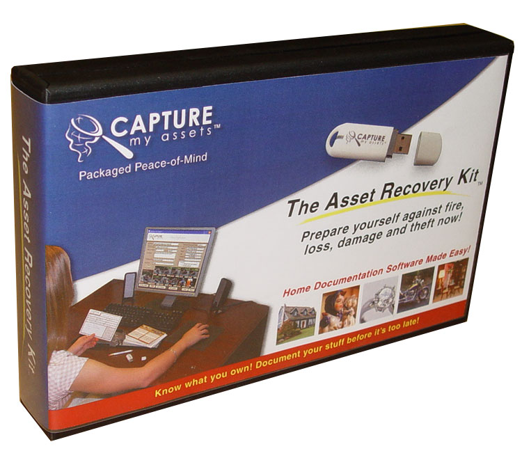 The Asset Recovery Kit provides just about everything you need to document your assets. Fill out the printed forms by hand (we even include a pencil), add pictures of your items (we don't actually provide a camera), put everything into the binder and then store it in a fireproof box or safety deposit box.