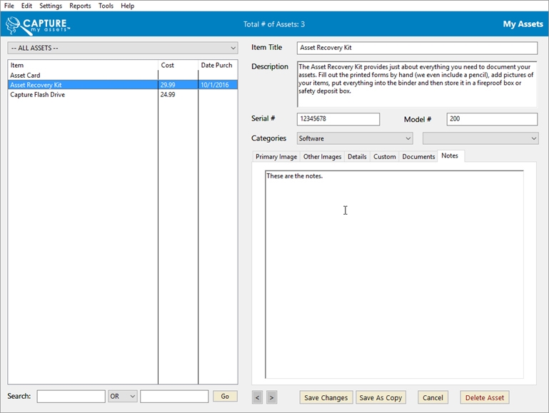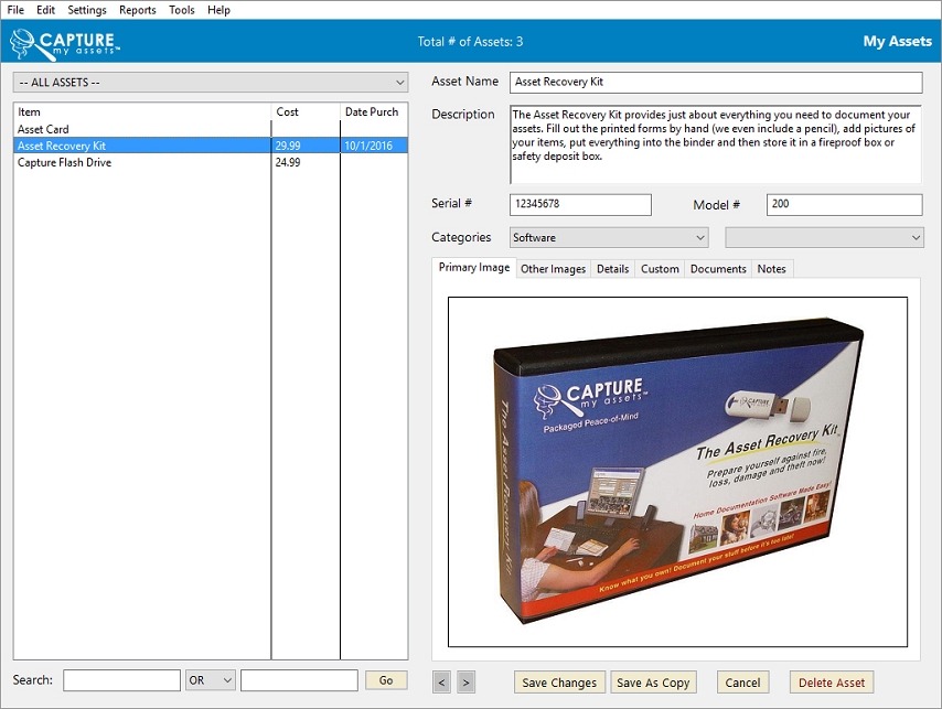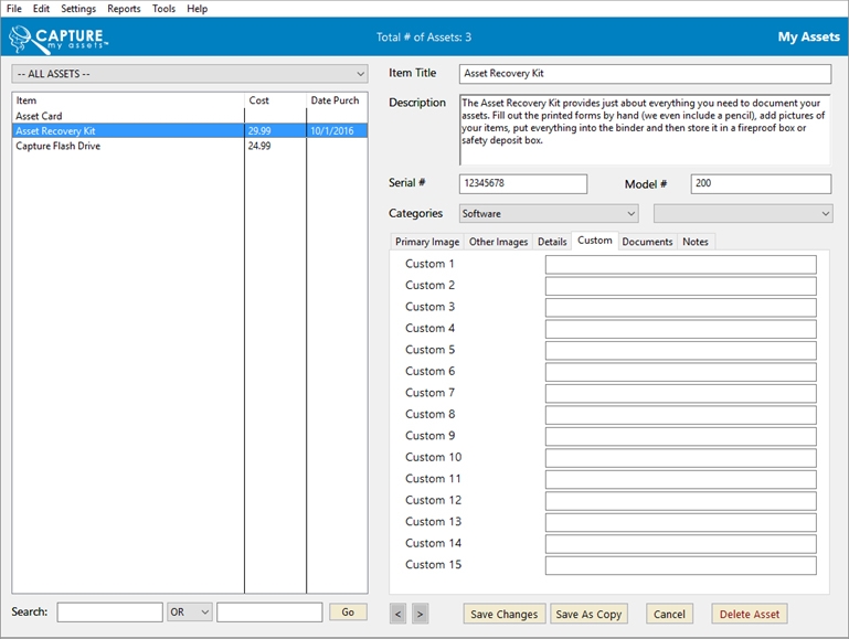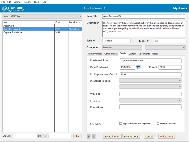 Unlimited # of assets The software has no maximum number of items that can be entered. The only limitation is the amount of space on the drive on which you are running it. For example, if you purchase the software as part of the Asset Recovery Kit then you receive it on a USB flash drive, which can handle over 600 items with multiple pictures each.