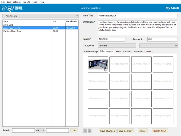 Multiple photos per asset Up to 17 photos can be assigned to each item. There is a primary image then 16 additional ones for other views of the item needed for identification. Many people take a picture of their receipt or appraisals - each of the images are stored at a large enough size to allow zooming to be able to see the smallest of details that were captured.