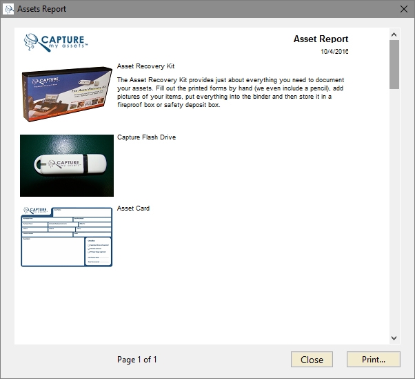 Sorting and Printing Use your locations, categories, insurance policies, and search functions to filter the list that is shown when managing your items or to output a web page that you can print or copy and paste as needed. Print 4"x6" pages of your photos or include the details of each asset to create a "combination" card to insert into your binder and double your space. You can also print a complete summary of all your assets or each individually to insert into a standard binder and supply to your insurance agent. New in version 4.07 - printing now uses your browser to print HTML, creating more flexibility and stability for your reports!